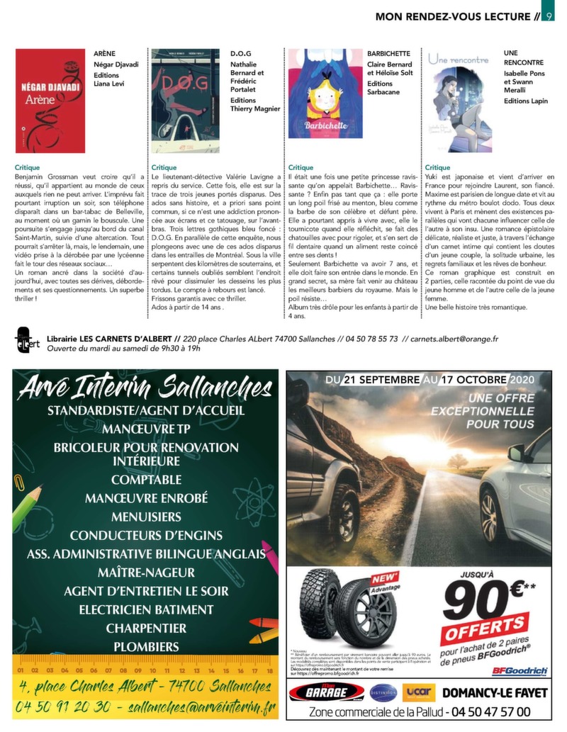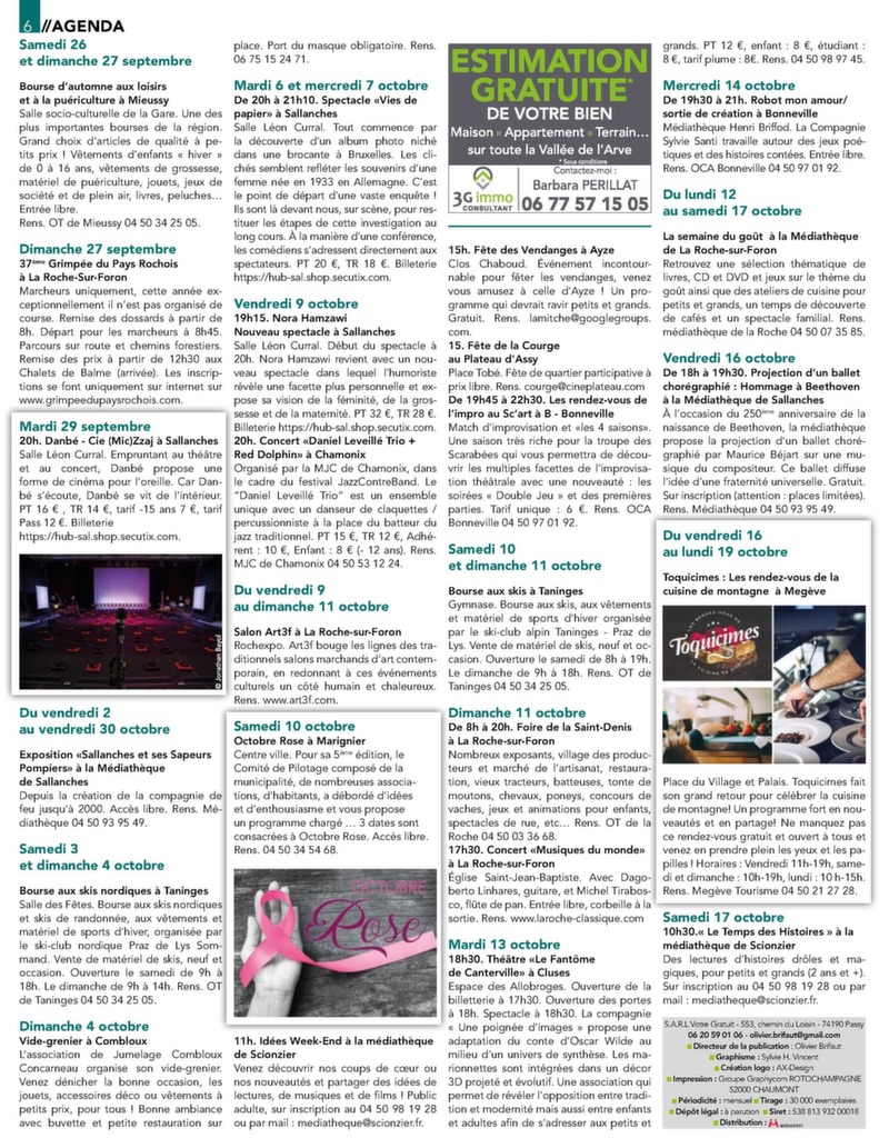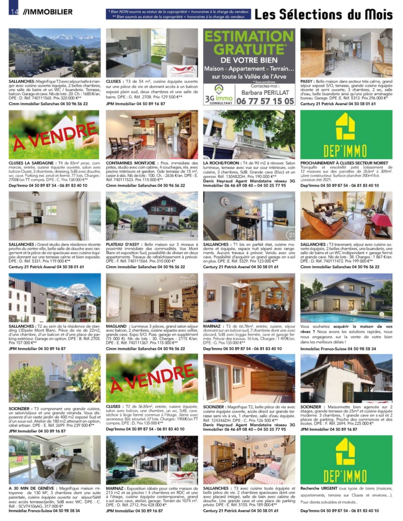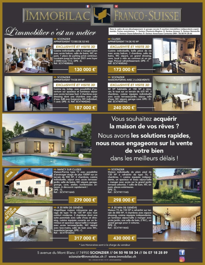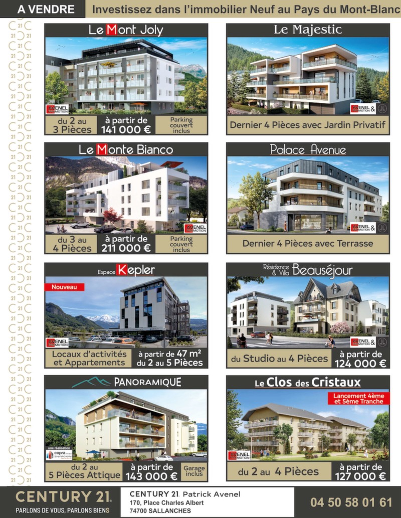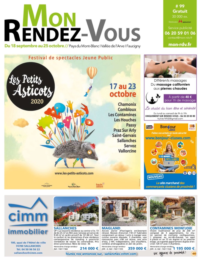1 // AUTOMOBILE # 99 Gratuit 30 000 ex. Distribution Service publicité 06 20 59 01 06 contact@mon-rdv.fr Faucigny I Vallée de l’Arve I Pays du Mont-Blanc Du 18 septembre au 25 octobre allée de l’Arve I Faucigny // Pays du Mont-Blanc I V Différents massages Du massage californien aux pierres chaudes À partir de 40 € pour 1h de massage Du lundi au samedi de 9h à 19h UNIQUEMENT SUR RENDEZ-VOUS - 06 32 23 05 00 tsylvie74950@gmail.com SALLANCHES MAGLAND CONTAMINES MONTJOIE UP ! La nouvelle résidence au centre-ville. T3 Ancien atelier d’horlogerie entièrement Chalet traditionnel de plus de 250 m² de 62.25 m² en RDJ avec terrasse privative de rénové. Maison d’environ 118 m² habitable composé de 3 appartements. Ce cha- 9.50 m² et jardin privatif de 121.60 m². Tcomprenant un séjour / salle à manger avec out let permet de multiples confi gurations, le confort et les prestations d’une résidence cuisine ouverte équipée, 3 chambres, une il propose: au rez-de-chaussé, un appt contemporaine de standing à proximité mezzanine avec vide sur séjour4 pièces et un , une salle T2 en duplex et au premier immédiate de toutes les commodités. Prix d’eau, 2 WC indépendants, une chaufétage, un superbe appartement duplex d’en-ferie, direct promoteur. Nbre de lot(s) : 36 combles aménageables et abri de jardin. viron 120 m² avec 3 chambres. Honoraires charge vendeur Honoraires charge vendeur Honoraires charge vendeur Réf : 740111560 214 000 € DPE : D. Réf : 740111555 359 000 € DPE : D. Réf : 740111530 1 195 000 €